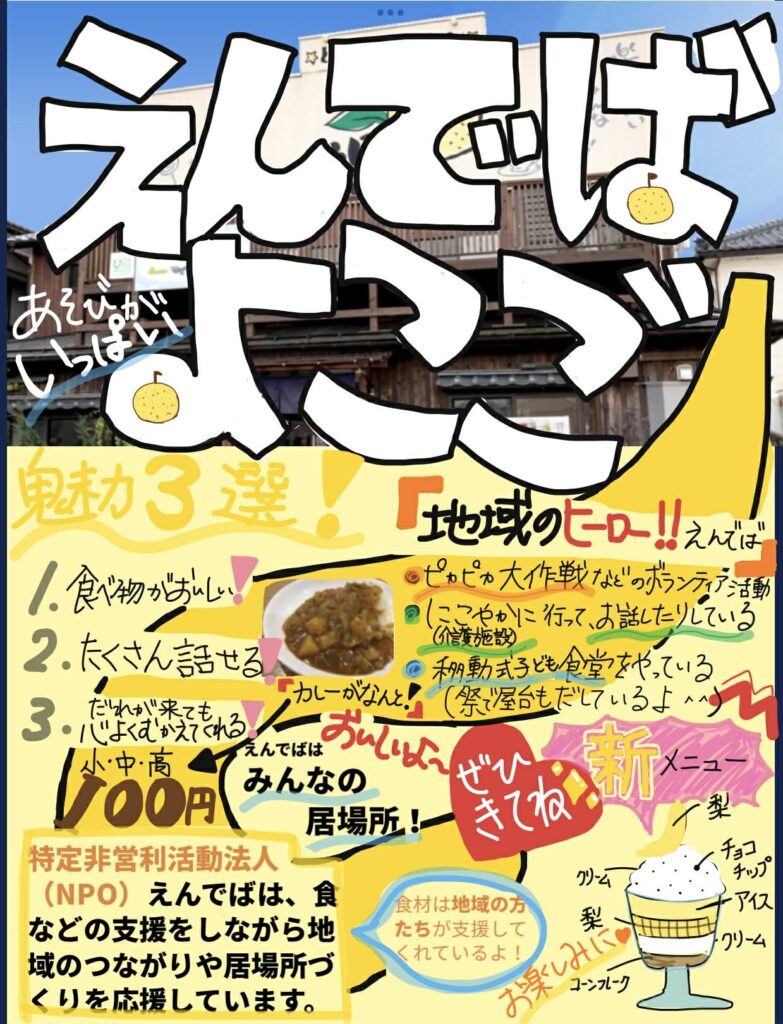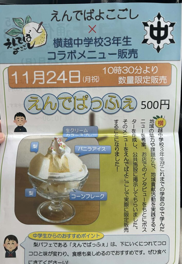 先月、地元中学生が発案したメニューを「えんでぱっふぇ」を販売し、大変好評でした。