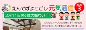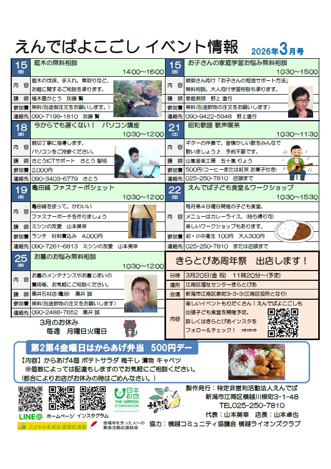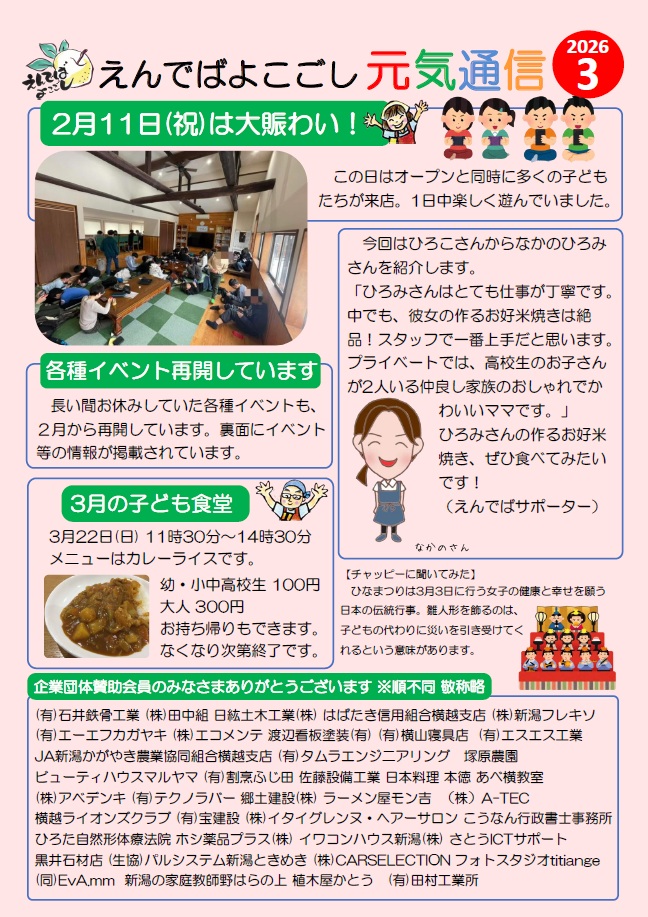 えんでばよこごし元気通信3月号 2026.03.01 最終更新日時 : 2026.03.02 admin えんでばよこごし元気通信 3月に入り、卒業シーズン。 店長の長男も高校を無事卒業しました。 そんなわけで3月号をお知らせします。
